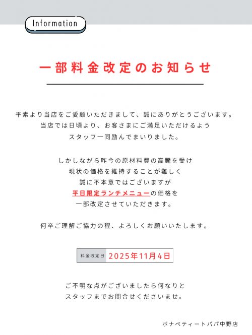 いつもご利用いただき、誠にありがとうございます。昨今の材料費の高騰に伴い、2025年11月4日より平日限定ランチメニューの価格を改定させていただきます。ご迷惑をおかけいたしますが、何卒ご理解の程よろしくお願いいたします。