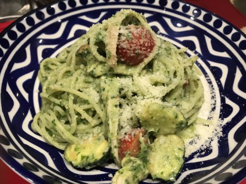 明日の週替わりパスタは鶏胸肉とズッキーニのジェノベーゼです! 自家農園のルッコラを使ったジェノベーゼソースになります。 天候が悪い日が続きますが皆様のご来店お待ちしております。