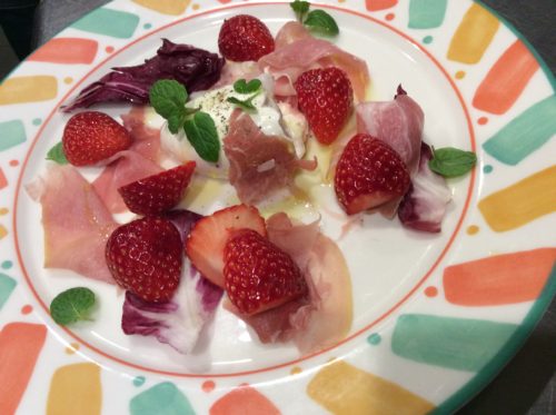本日の冷菜 【とちおとめと生ハム、マスカルポーネの盛り合わせ】@800 スパークリングワインで乾杯ですね!!