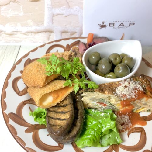 本日の前菜盛り合わせは、フリットを2種と茄子のマリネ、フリッタータと国産牛カルパッチョと、オリーブの実を盛り付けました。ステイホームのお供にもぜひどうぞ!