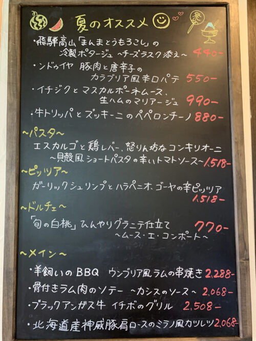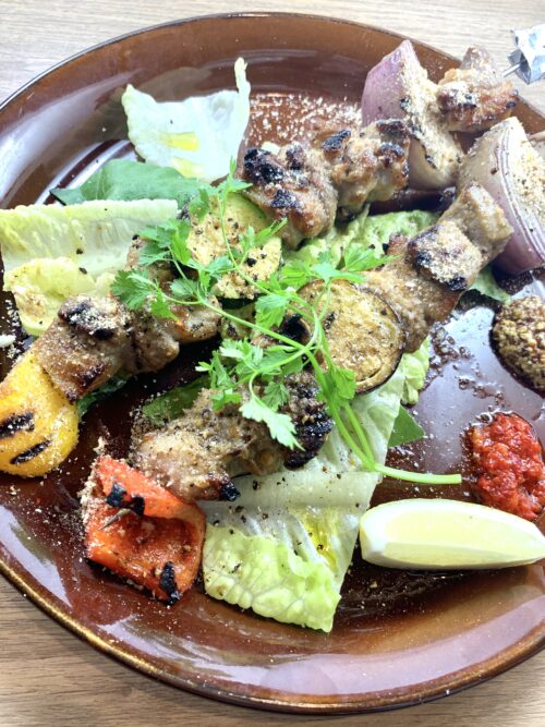 夏メニュー後期より「羊飼いのBBQ ウンブリア風ラム肉の串焼き」。 中野店で人気のメニューを両店の夏のメイン料理としてご用意! 鉄串に刺さったお野菜とラムで気分はBBQ! 冷たいお飲み物とご一緒にどうぞ!