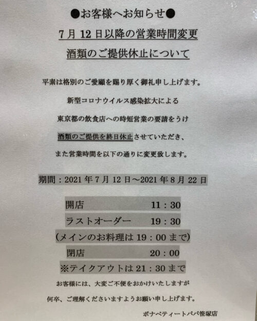 2021/07/12〜2021/08/22の間、緊急事態宣言発令による東京都からの要請を受け、営業時間の短縮を継続し、併せて酒類のご提供を【終日休止】致します。何卒ご理解ご協力を賜ります様よろしくお願い申し上げます。
