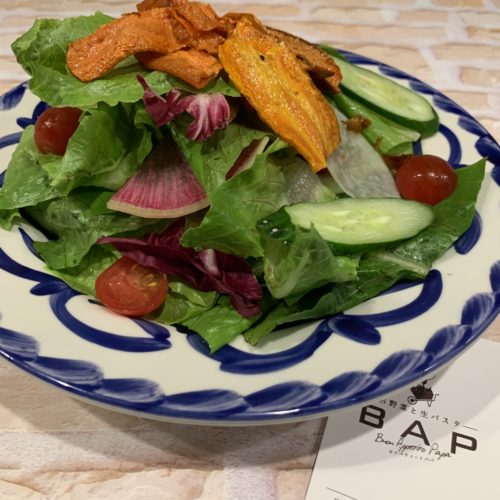 パスタセットのサラダに、にんじんチップスを数量限定でお乗せしています!ぜひお試し下さい!