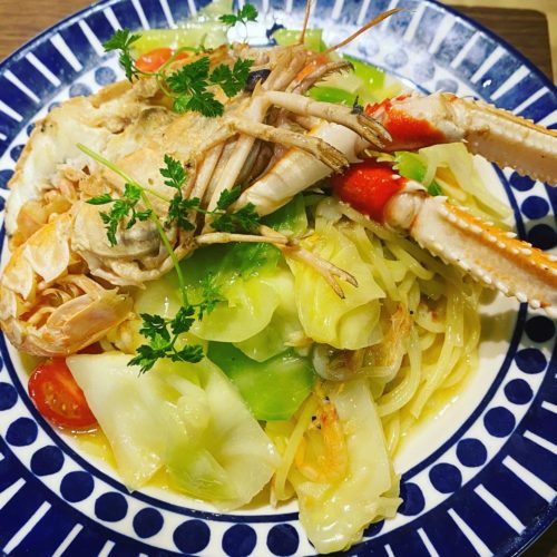 春のおすすめメニューから! 桜海老とスキャンピ、春キャベツのペペロンチーノ! ボナペティートパパ笹塚店で春のイタリアンいかがですか!