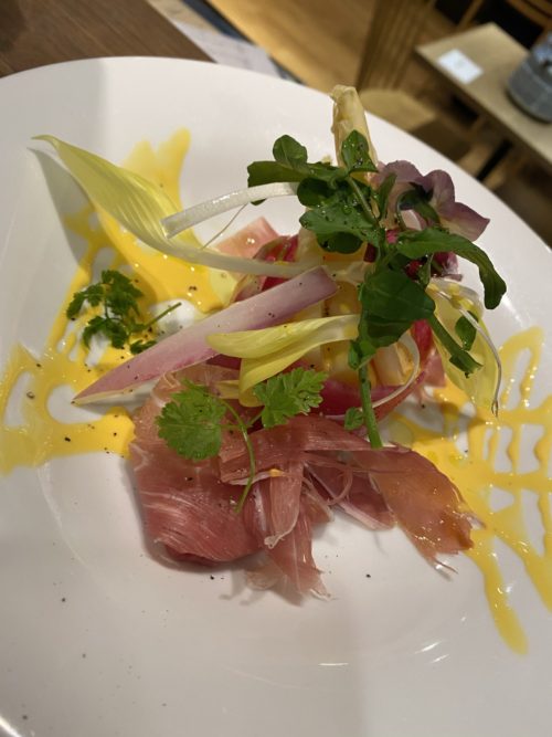 ホワイトアスパラと生ハム、トリュフ卵黄の前菜! 旬なホワイトアスパラ、始まりました! ご来店お待ちしております!