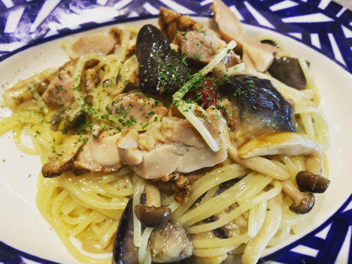 本日の季節パスタは、鶏もも肉としめじ、揚げナスのペペロンチーノです! 暑い時期にペペロンチーノ美味しいですよね! 御来店お待ちしております。