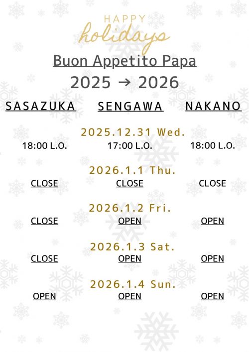中野店の年末年始の営業時間についてお知らせします。 ご不明な点は店舗までお気軽にお問い合わせください。 年末年始も御来店お待ちしております!