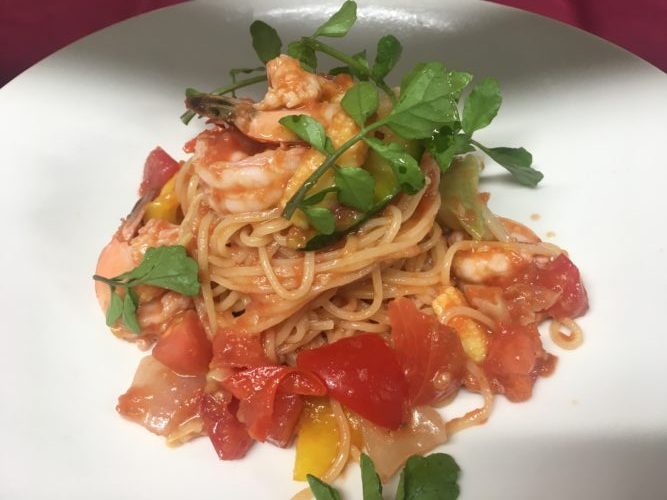 暑い!暑すぎですね・・・というわけで?冷製パスタあります!!海老と夏野菜の冷製トマトソース★ボナパパはお盆も休まず営業していますので皆様の御来店お待ちしています。