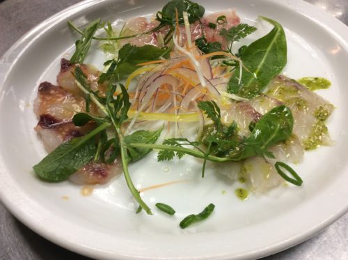 お待たせしました!本日から豊洲市場直送が開場しました☆本日のカルパッチョ3種盛りは ・クロダイ・スズキ・クロムツです!!