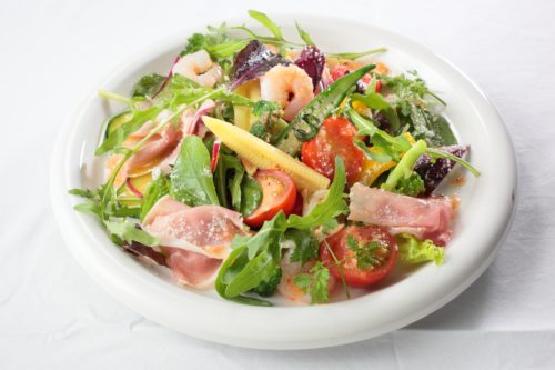 エビのカクテルと生ハム、厳選野菜のサラダプレート★ランチでやっています。お野菜不足の方はいかがですか!?