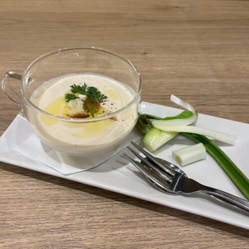 ボナペティートパパ🌸春のおすすめメニューから!春野菜を添えた新じゃが芋のヴィシソワーズ★春野菜をスープにつけてお召し上がりください。ご来店お待ちしております。