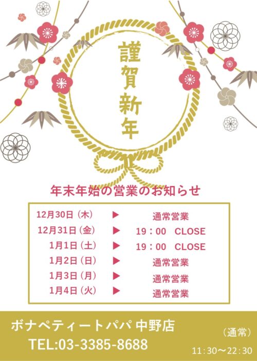 年末年始の営業時間のお知らせです。31日と元旦は閉店時間が早まります🎍皆様のご来店お待ちしております★