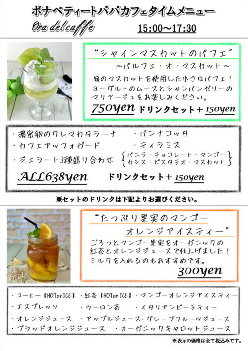 ボンジョルノ♪中野店では平日の15:00~17:30の間、お得なドルチェセット始めました!コーヒーブレイクを是非とも当店でいかがでしょうか!?ご来店お待ちしております。