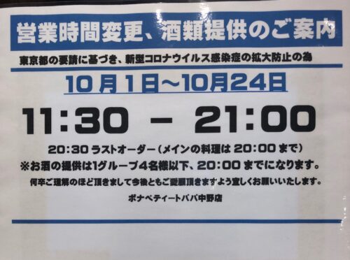 10/1~10/24の間、営業時間の変更と酒類販売の再開を致します。酒類販売は4名様以下で20:00までになります。皆様のご理解、ご協力をお願い致します。ご来店お待ちしております。